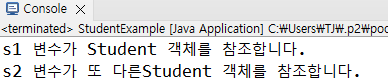 System.out.println("s2 변수가 또 다른 Student 객체를 참조합니다.");