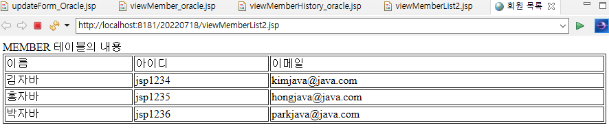 위의 손서에 맞춰서 테이블로부터 정보를 읽어와 출력하는 JSP예제를 만들어 보겠습니다.