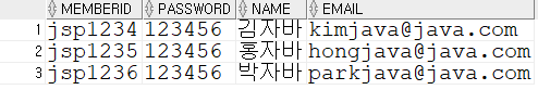 VALUES('jsp1236', '123456', '박자바', 'parkjava@java.com');