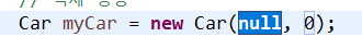 new Car에 빨간줄에 그어져 있고 마우스를 근쳐로 가보니 문자열타입과 정수가 필요 하다고 나옵니다 눌러주세요
