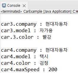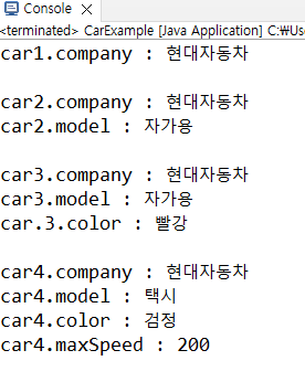 Car car4 = new Car("택시", "검정", 200);
