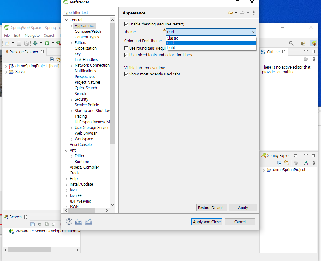 window -> perferences 에 들어가시고 General -> Appearance 에서 변경 가능합니다