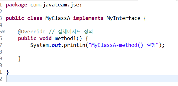 이제 MyClassA와 MyClassB를 객체로 생성하고 인터페이스 변수에 메서드 1. 메서드 2를 호출해 보고 결과를 보겠습니다.