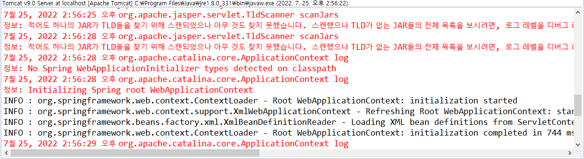 정보: 적어도 하나의 JAR가 TLD들을 찾기 위해 스캔되었으나 아무 것도 찾지 못했습니다. 스캔했으나 TLD가 없는 JAR들의 전체 목록을 보시려면, 로그 레벨을 디버그 레벨로 설정하십시오. 스캔 과정에서 불필요한 JAR들을 건너뛰면, 시스템 시작 시간과 JSP 컴파일 시간을 단축시킬 수 있습니다.