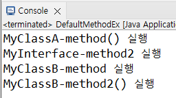이제 MyClassA와 MyClassB를 객체로 생성하고 인터페이스 변수에 메서드 1. 메서드 2를 호출해 보고 결과를 보겠습니다.