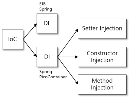IoC(제어의 역전)를 적용함으로써 객체들은 시스템 내의 각 객체를 조정하는 어떤 외부의 존재에 의해 생성 시점에서 의존성을 부여 받는다. 즉 의존성이 객체로 주입(inject)된다는 말이다.