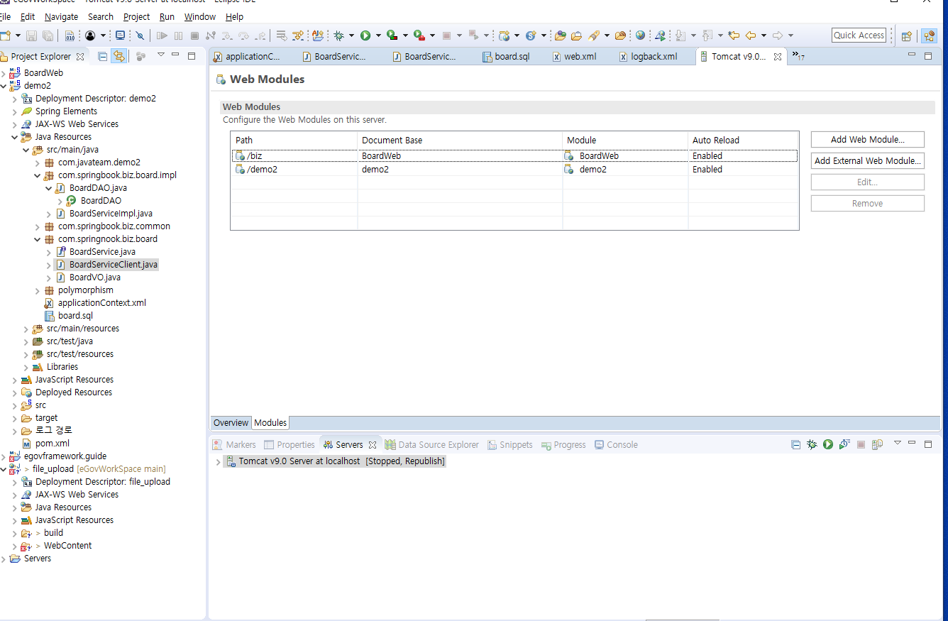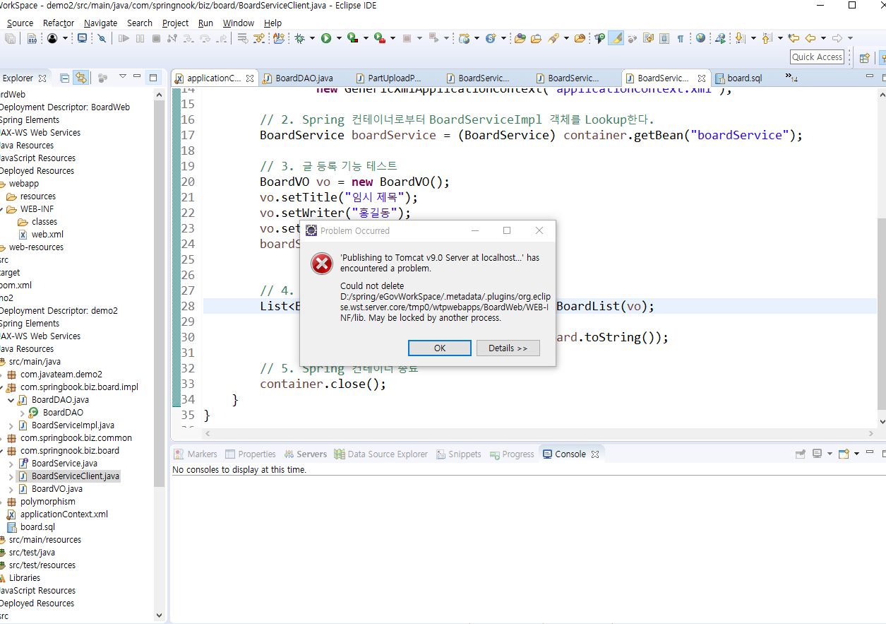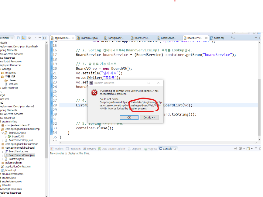 Could not delete D:/spring/eGovWorkSpace/.metadata/.plugins/org.eclipse.wst.server.core/tmp0/wtpwebapps/BoardWeb/WEB-INF/lib. May be locked by another process.