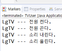 클래스 선언 부분에 @Component를 설정해줌으로써 스프링 컨테이너는 해당 클래스를 bean 으로 생성하고 관리할수 있습니다. 수정한 파일들을 모두 저장하고 TVUser 프로그램을 실행하면 다음과 같은 실행 결과를 확인 할 수 있습니다.