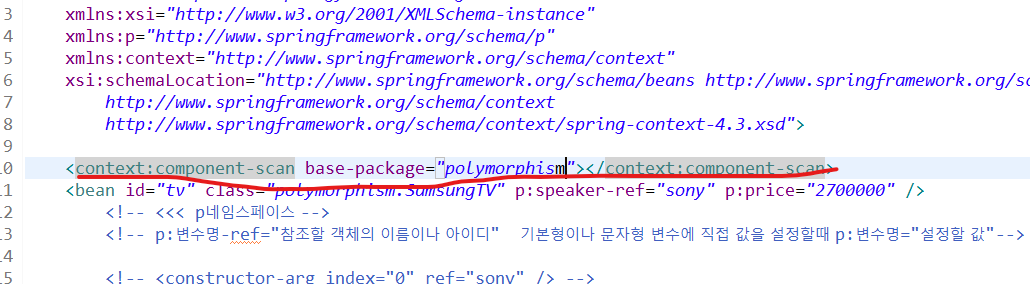 여기서 중요한것은 <context:component-scan> 엘리먼트의 base-package 속성인데, 만약 속성값을 "com.springbook.biz." 형태로 지정하면 com.springbook.biz 패키지로 시작하는 모든 패키지를 스캔대상에 포함 시킵니다.
