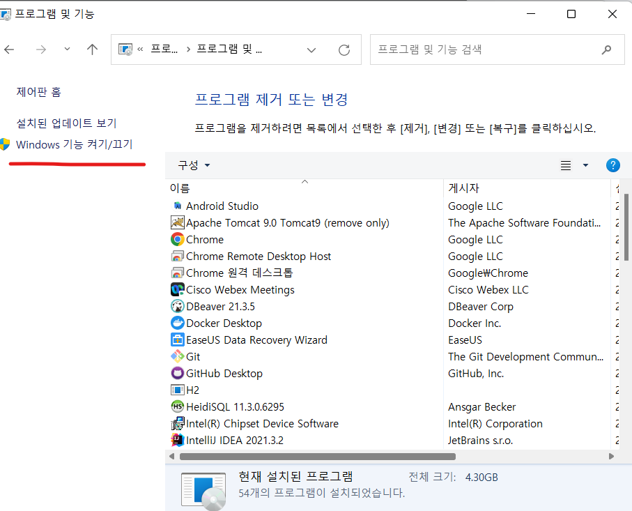 와 windows 기능 켜기/끄기 를 통해서 하는방법이 있습니다. 저는 windows 기능 켜기/끄기로 하였습니다.
