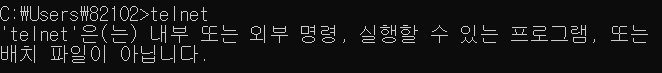 명령어 => pkgmgr /iu:"Telnetclient" // 텔넷 클라이언트가 설치 되어 있지 않는 경우 오류 문구 표시됨