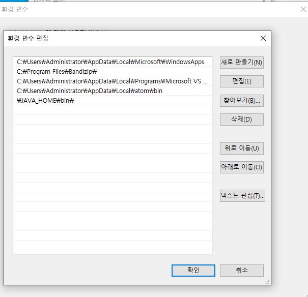 위에 사용자와 아래에 시스템 변수 2가지중에 십습용이니 위 Administator에 대한 사용자 변수에 새로 만들기