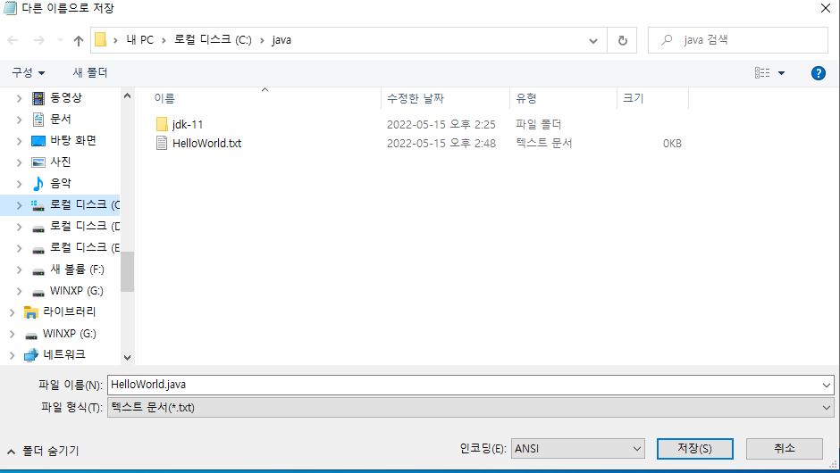 파일 이름 뒤에. java로 하고 인코딩은 ANSI로 저장합니다.