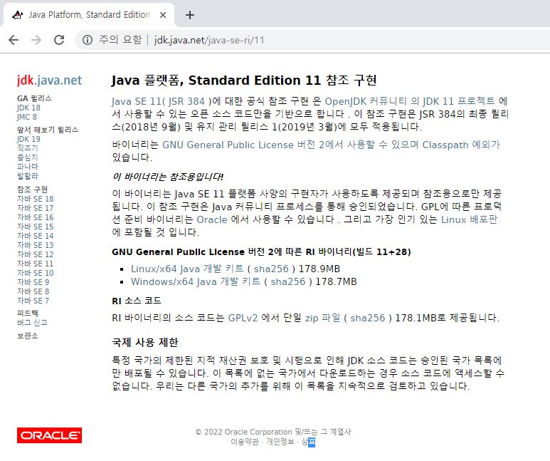 일단 http://jdk.java.net/java-se-ri/11 사이트로 접속하여 운영체제에 맞는 JAVA SE 11 다운로드합니다. (다른 버전도 상관없음)