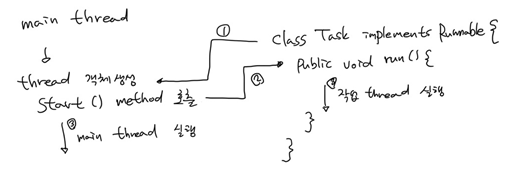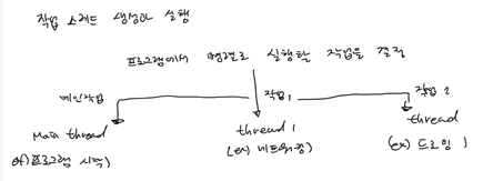 옆의 그림을 보면 메인 스터드가 작업 스레드 1을 생성하고 실행 후 다음, 작업 스레드 2를 생성하고 실행합니다.