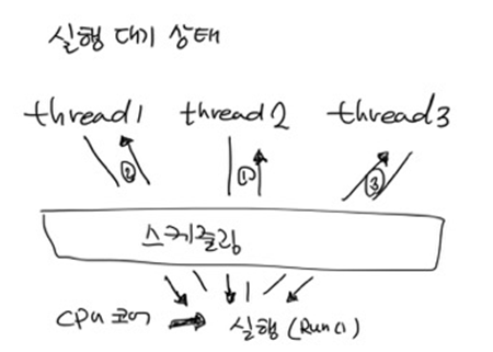 스레드의 개수가 코어의 수보다 많을 경우 스레드를 어떤 순서에 의해 동시성으로 실행할 것인가를 결정해야 하는데, 이것을 스레드 스케줄 일라고 합니다. 스레드 스케줄링에 의해 스레드들을 아주 짧은 시간에 번갈아가면서 그들의 run() 메서드를 조금씩 실행합니다.