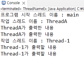 - 스레드는 자신의 이름을 가지고 있습니다. 스레드의 이름이 큰 역할을 하는 것은 아니지만, 디버깅할 때 어떤 스레드가 어떤 작업을 하는지 조사할 목적으로 가끔 사용됩니다. 메인 스레드는 "main"이라는 이름을 가지고 있고, 우리가 직접 생성한 스레드는 자동적으로 "Thread-n"이라는 이름으로 성정 됩니다. n은 스레드의 번호를 말하고 Thread -n 대신 다른 이름을 설정하고 싶다면 Thread 클래스의 setName() 메서드를 변경하면 됩니다.