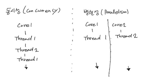 동시성은 멀티 작업을 위해 하나의 코어에서 멀티 스레드가 번갈아가며 실행하는 성질을 말하고, 병렬성은 멀티 작업을 위해 멀티 코어에서 개별 스레드를 동시에 실행하는 성질을 말합니다.