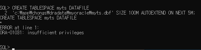 - 논리적 개념인 테이블스페이스도 물리적으로는 파일로 존재하므로 실제 저장될 파일 이름과 위치가 필요합니다. 그래서