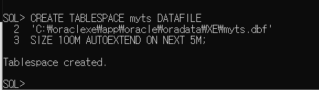 - 'C:\oraclexe\app\oracle\oradata\XE\ 폴더로 경로설정 myts.dbf 라는 이름으로 생성
