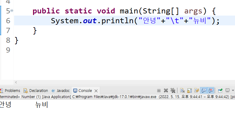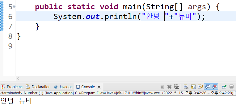 정상출력됨 안녕 뉴비로 출력시키고 싶으면 "안녕(스페이스바)"하고 출력하면 띄워쓰기 되서 출력됨