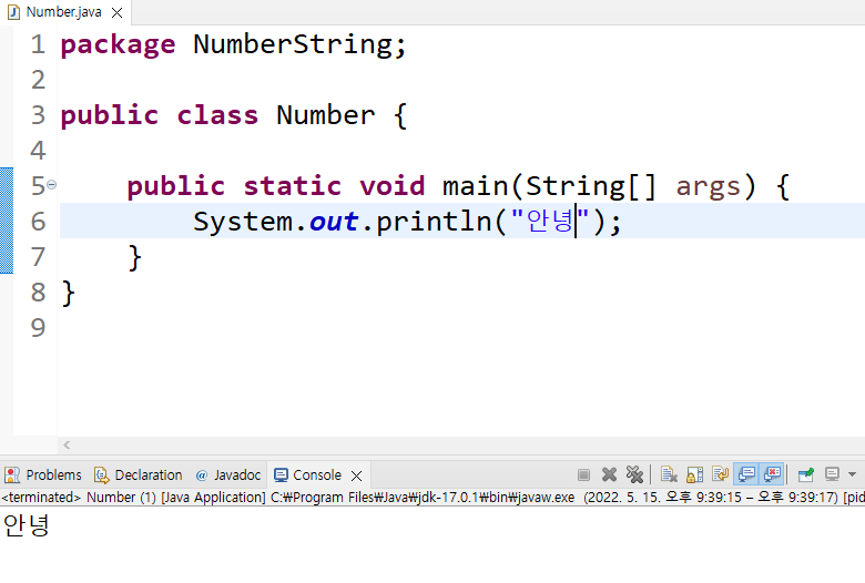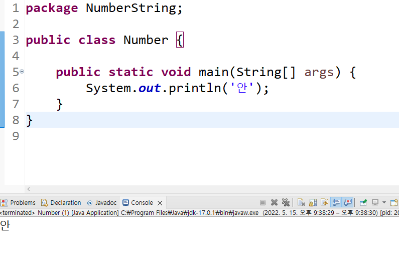안녕이 정상적으로 출력됨 안녕을 ''로 감싸서 출력할순없지만 한글자는 ""으로 감싸서 출력은 가능하다.