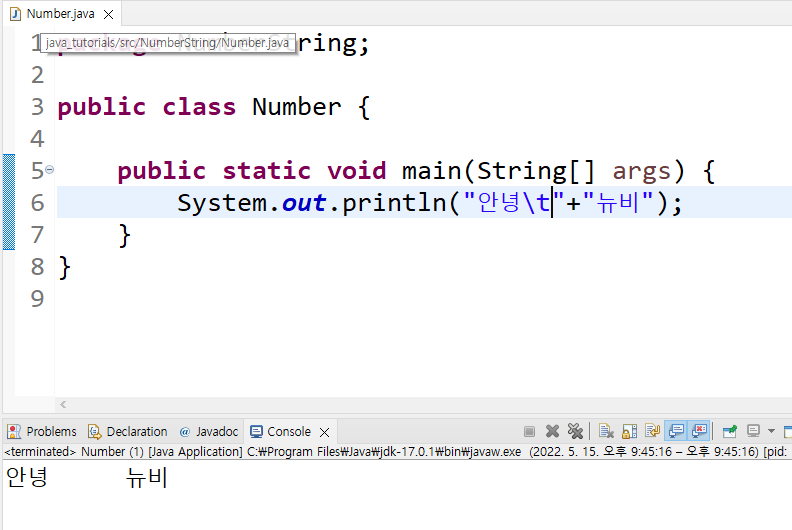 외에도 "\t" 을 사용하면 스페이스바를 4번 누른것과 같이 글이 벌려집니다.