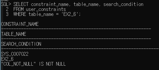 EX2_6 테이블의 col_not_null 칼럼이 부여한 제약조건이 SYS_C007022란 이름으로 생성됐음을 볼 수 있습니다.