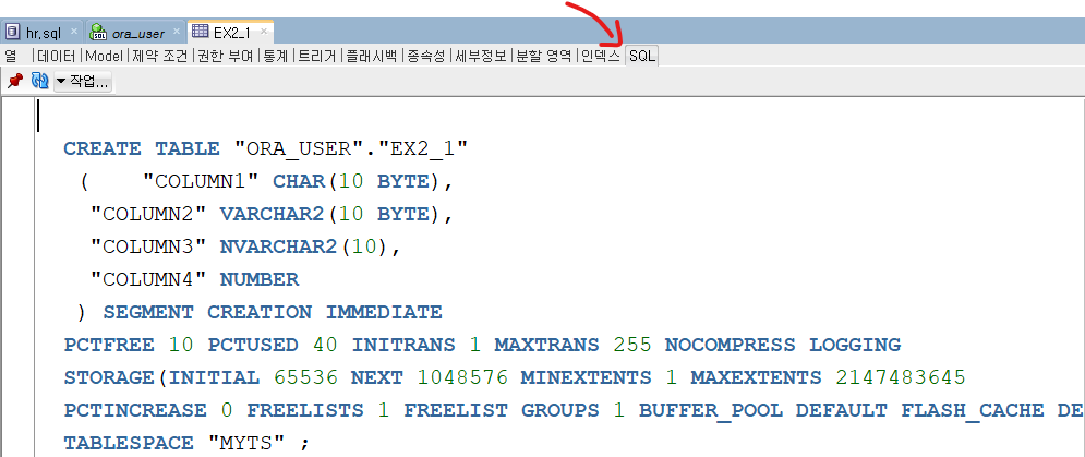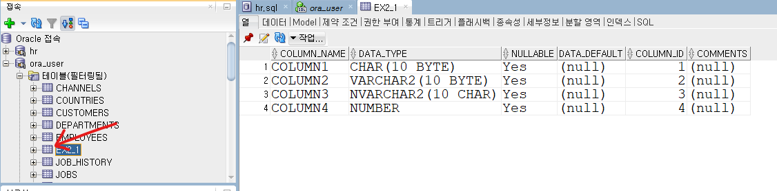 sql developer 상에서 왼쪽 ora_user 밑의 테이블을 선택하고 안에 테이블을 눌러보면