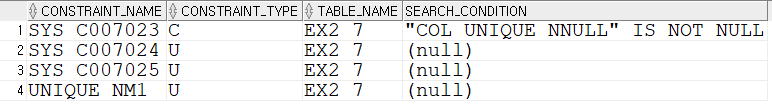UNIQUE 제약 조건이 3개가 만들어졌습니다. UNIQUE NM1 제약조건은 CONSTRAINTS 키워드를 사용해 제약조건명을 명시해서 만들었으므로 UNIQUE_NM1이란 이름으로 생성됐음을 확인할 수 있습니다.