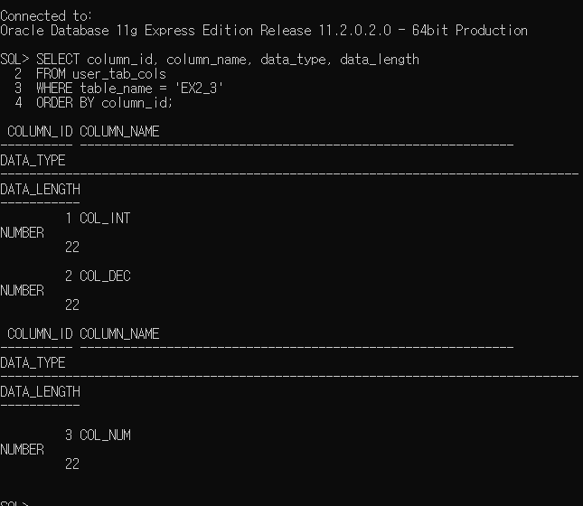 보면 아이디는 COL_INT 타입은 NUMBER 길이는 22라고 나오는 걸 확인할 수 있습니다.