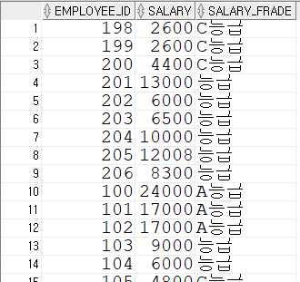 WHEN salary > 5000 AND salary <= 15000 THEN '등급'