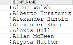 LIKE 'A%'의 의미는 사원명 첫 글자는 A로 시작하되 나머지는 어떤 글자가 와도 상관없이 모두 조회하라는 의미입니다.