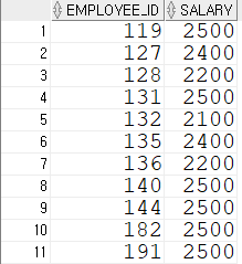 이 쿼리문은 NOT으로 급여가 2500보다 크거나 같지 않은 사원, 즉 2500 이하인 사람들을 반환 하고 있습니다.