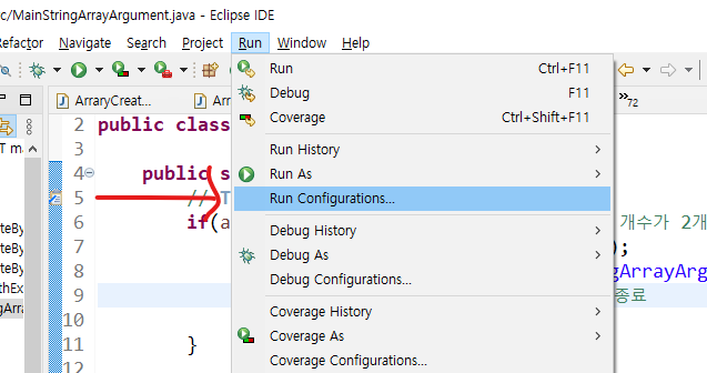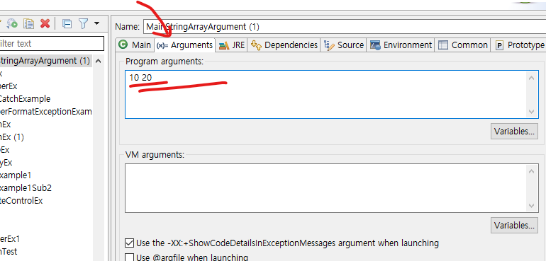 Arguments 를 선택한후에 밑에 program argument에 값을 써주고 출력해보면
