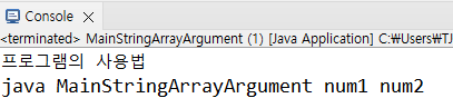 이렇게만 출력되고 아래의 값은 보이지 않습니다. 그 이유는 실행할 때 매개값을 주지 않았기 때문에 길이 0 인 String 배열이 매개값으로 전달됩니다. 따라서 args.length는 0이므로 3라인의 if 조건식이 ture가 되어 if문의 블록이 실행하게 된것입니다.