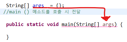 "java 클래스" 로 프로그램을 실행하면 JVM은 길이가 0인 String 배열을 먼저 생성하고 main() 메소드를 호출할 때 매게값으로 전달합니다.