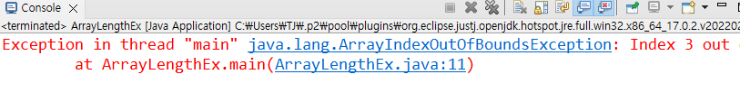그러므로 for문을 사용할때 scores.length가 아닌 4같은 수를 지정해서 넣어준다면(n(길이)-1을 해줘야함) 을 사용한다면 인덱스를 초과해서 ArrayIndexOutOfBoundsException이 발생합니다.