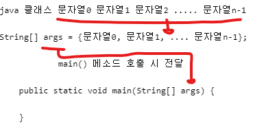 만약에 java 클래스 뒤에 공백으로 구분된 문자열 목록을 주고 실행하면, 문자열 목록으로 구성된 String[] 배열이 생성되고 main() 메소드를 호출할 때 매개값으로 전달됩니다.
