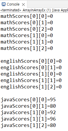 System.out.println("mathScores[" + i + "][" + k + "]=" + mathScores[i][k]);