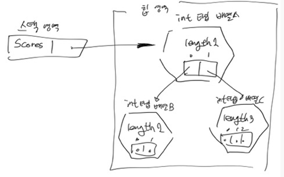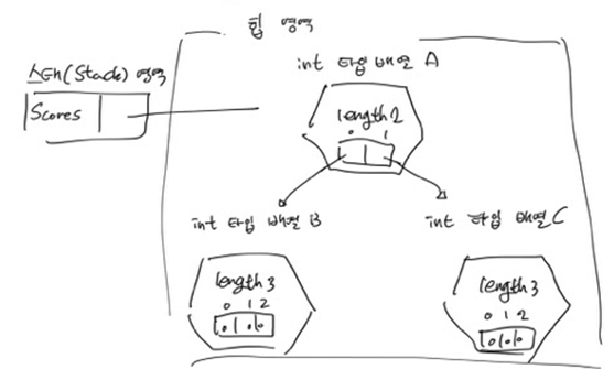 배열 변수인 scores는 길이 2인 배열 A를 참조합니다. 배열 A의 scores[0]은 다시 길이 3인 배열 B를 참조하는데