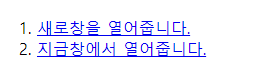 <li><a href ="https://s-tudyprogramming.tistory.com/60" target ="_blank">새로창을 열어줍니다.</a></li>