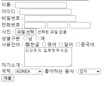 자기소개 : <textarea rows="4" cols="20">간단하게 입력해주세요</textarea><br>