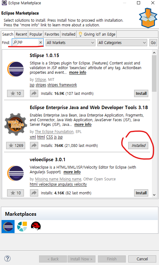 find에 jsp 쳐주시면 밑에 화면처럼 나오는데 Enterprise라 나온 것을 다운로드해줍니다.