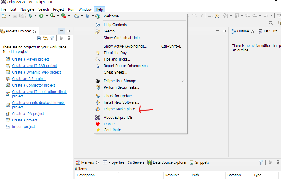 이클립스에 들어오셔서 Eclpse Marketplace 눌러주세요