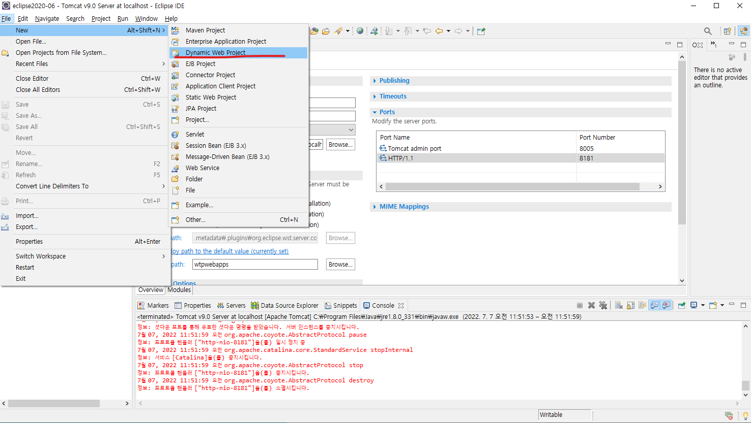 이제 file new Dynamic web Project 클릭해주고 프로젝트를 만들어줍니다.
