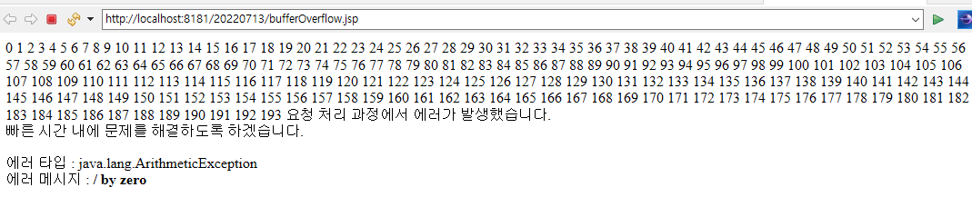 <%= 1 / 0 %> <!-- 자바에서 0으로 나누면 ArithmeticException이 발생됩니다. 익셉션이 발생하므로