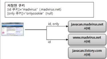 - www.madvirus.net - 특정 도메인에 대해서만 쿠키를 전송합니다. - 웹 브라우저는 도메인이 벗어난 쿠키는 저장하지 않습니다.